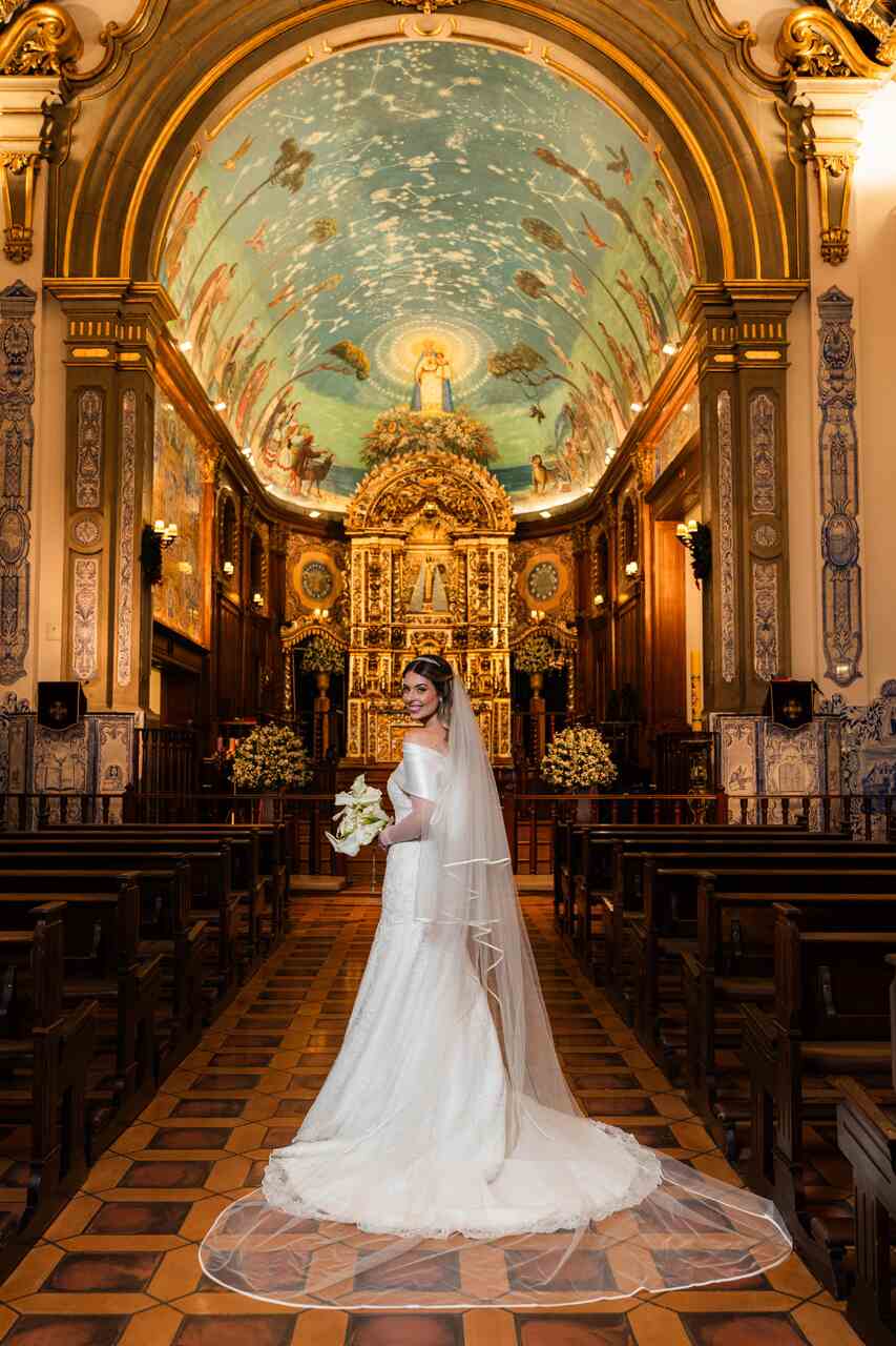 1. Casamento em igreja ou salão de festas: Eventos formais e noturnos, permitem vestidos mais estruturados e imponentes. A escolha por saias amplas em tecidos nobres, toques de brilho, véus bordados, decotes fechados, corsets bem definidos e aplicações mais elaboradas, ajudam a compor um visual clássico e sofisticado. A proposta é que o vestido assuma uma estética mais marcante, sem perder a essência da noiva.
